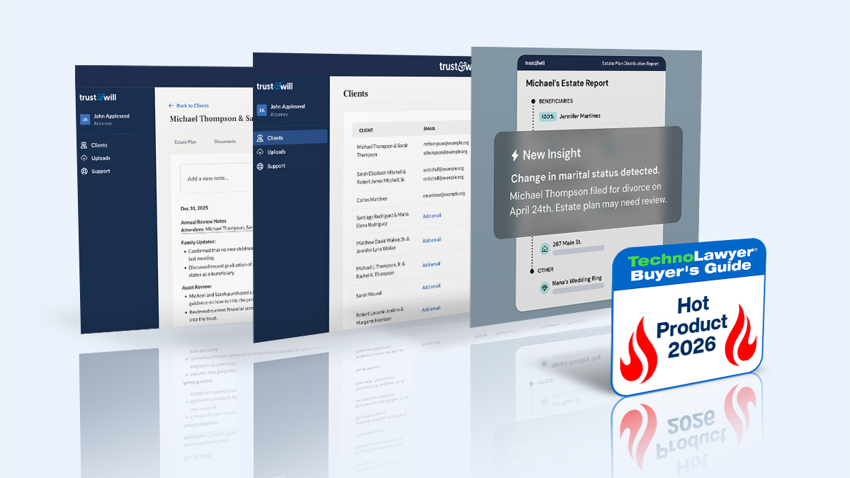 Trust & Will for Attorneys is an AI-enabled estate planning platform running on EstateOS that helps law firms manage clients, monitor life events, and analyze documents to keep estate plans current. Read our new TechnoLawyer Buyer's Guide report below.
